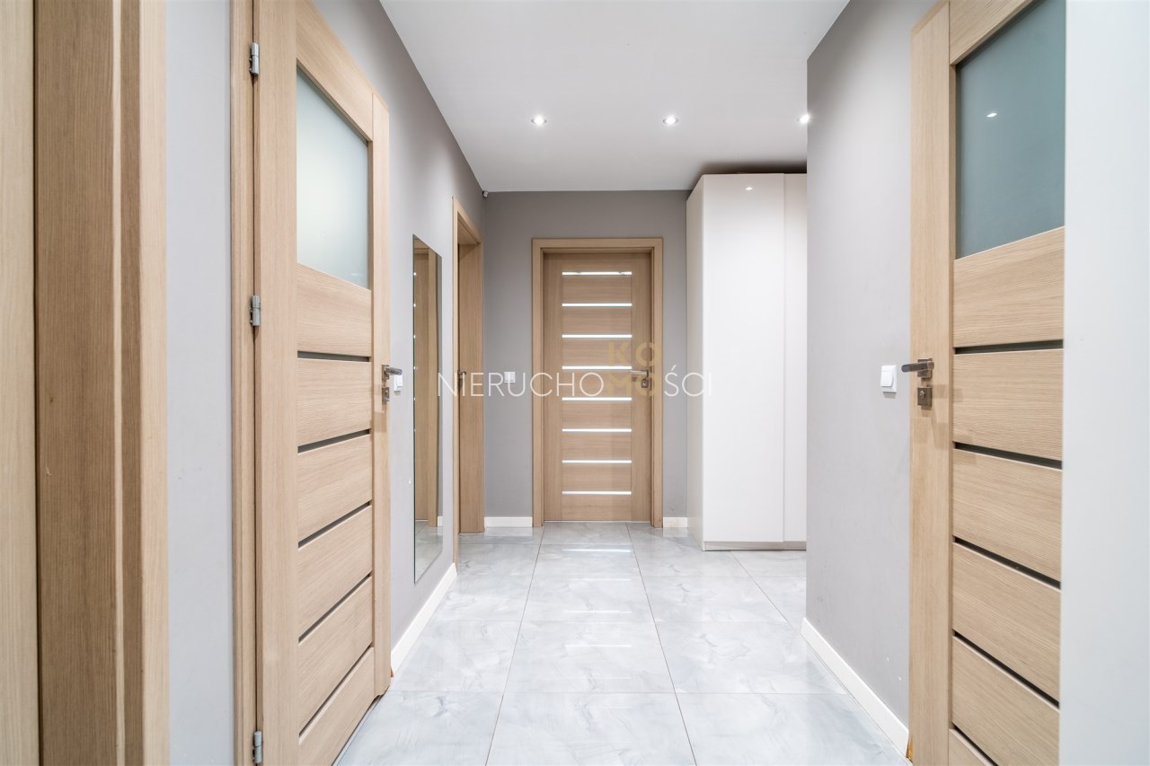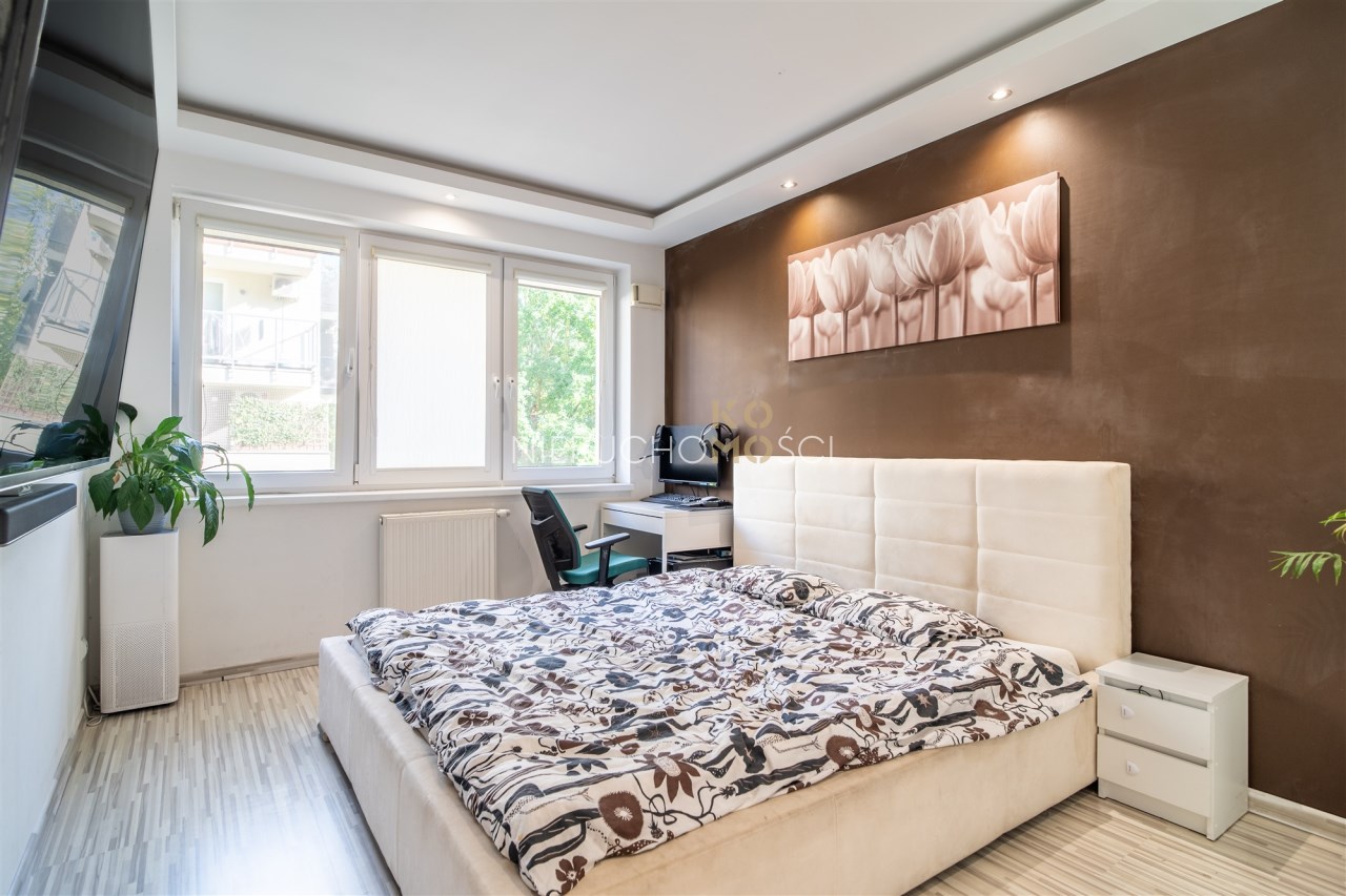Mieszkanie - jasne, przestronne położone na parterze w niskim 2 piętrowym bloku. Największym atutem jest niewątpliwie funkcjonalny układ z dodatkowym, dużym, szerokim tarasem. Mieszkanie jest w pełni wykończone i wyposażone. Do dyspozycji są dwie łazienki – większa wyposażona w wannę oraz mniejsza z kabiną prysznicową. Strefa dzienna z aneksem kuchennym łączy się z tarasem, który w sezonie wiosenno-letnim tworzy dodatkową przestrzeń do wypoczynku. Układ mieszkania obejmuje trzy sypialnie, w tym jedna z wydzieloną garderobą. Dodatkowo do mieszkania przynależy komórka lokatorska oraz dwa miejsca postojowe w hali garażowej. Dla podniesienia poziomu bezpieczeństwa w mieszkaniu zamontowano system alarmowy, czujniki otwarcia drzwi i okien, wejście z kontrolą dostępu, a także zainstalowano kamery na klatce schodowej. Wszystkim możemy sterować i zarządzać z poziomu aplikacji w telefonie. Dla komfortu założono klimatyzację.