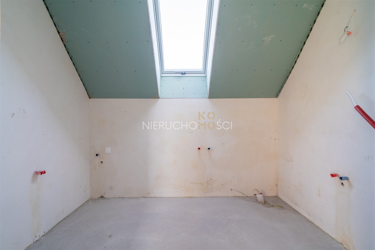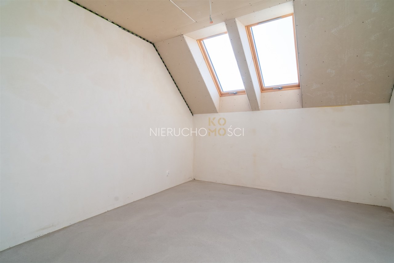 Piętro domu to zdecydowanie część prywatna w której mieszczą się łącznie 4 sypialnie z czego jedna - główna z osobną garderobą. Łazienka jest duża, bez problemu mieści się prysznic oraz wanna a okno dachowe doświetla nam wnętrze. Ściana kolankowa jest wysoka, a więc pomieszczenia ze skosami są funkcjonalne i ustawne. Istnieje możliwość zaaranżowania dodatkowej przestrzeni na poddaszu ok 35 m2.