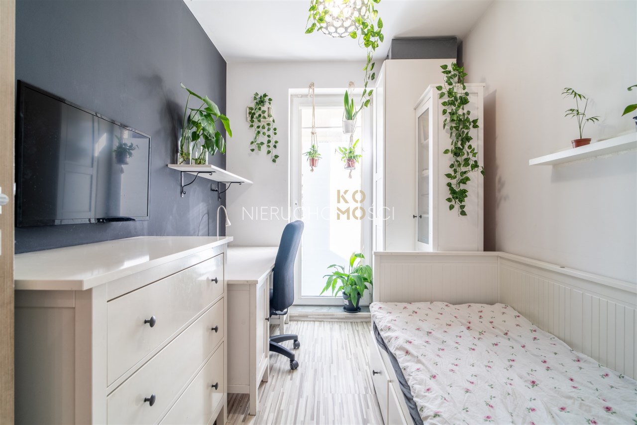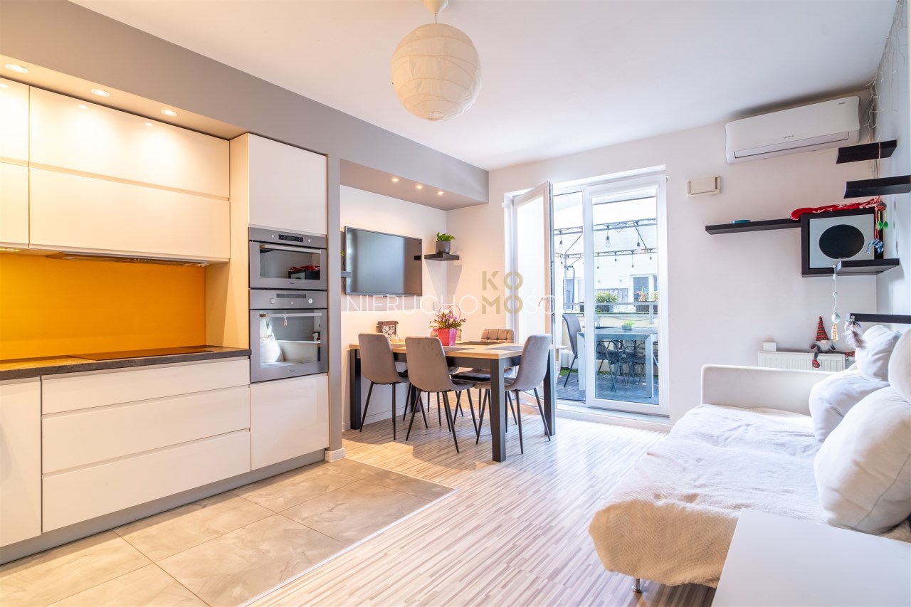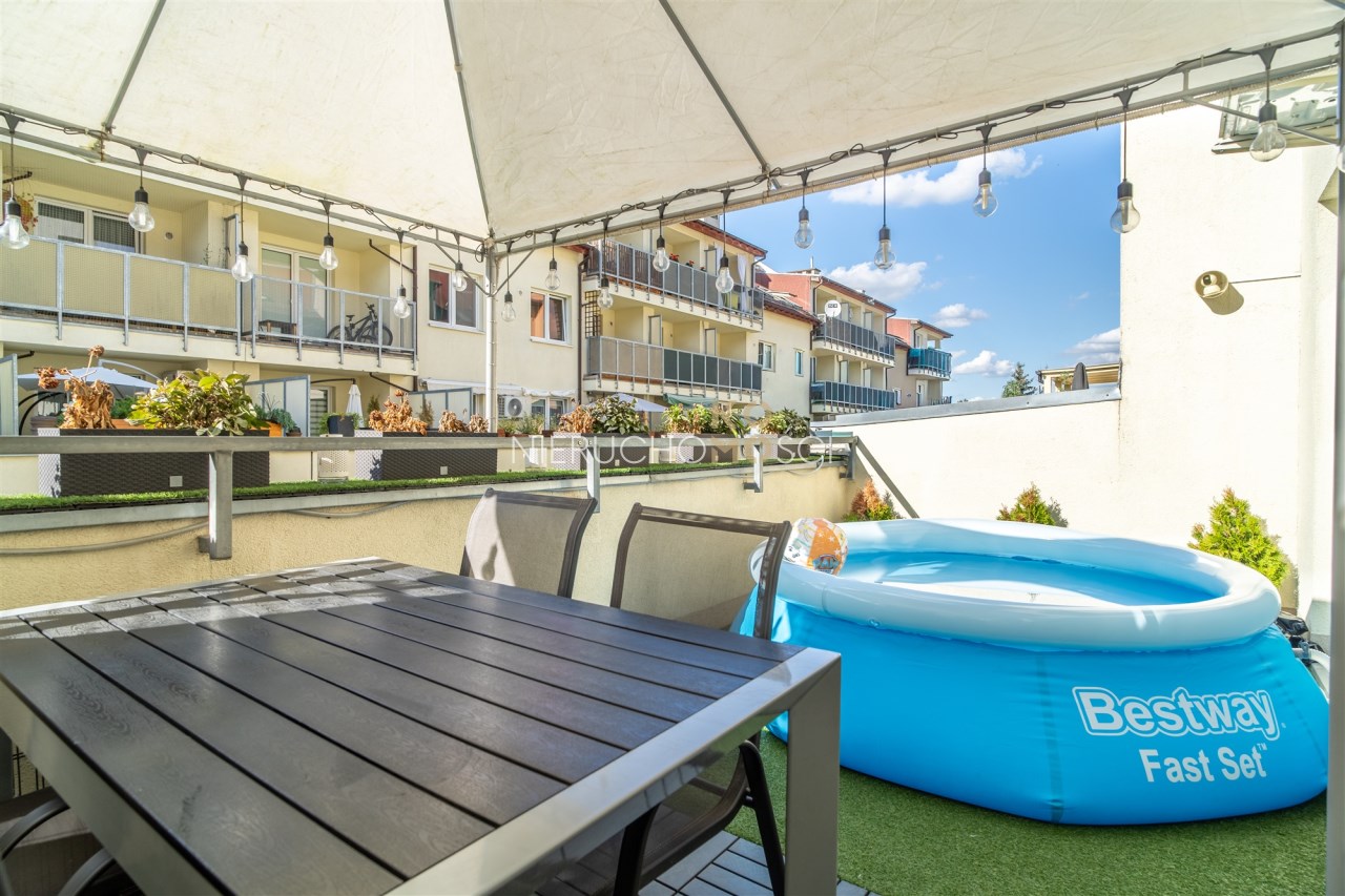 Mieszkanie - jasne, przestronne położone na parterze w niskim 2 piętrowym bloku. Największym atutem jest niewątpliwie funkcjonalny układ z dodatkowym, dużym, szerokim tarasem. Mieszkanie jest w pełni wykończone i wyposażone. Do dyspozycji są dwie łazienki – większa wyposażona w wannę oraz mniejsza z kabiną prysznicową. Strefa dzienna z aneksem kuchennym łączy się z tarasem, który w sezonie wiosenno-letnim tworzy dodatkową przestrzeń do wypoczynku. Układ mieszkania obejmuje trzy sypialnie, w tym jedna z wydzieloną garderobą. Dodatkowo do mieszkania przynależy komórka lokatorska oraz dwa miejsca postojowe w hali garażowej. Dla podniesienia poziomu bezpieczeństwa w mieszkaniu zamontowano system alarmowy, czujniki otwarcia drzwi i okien, wejście z kontrolą dostępu, a także zainstalowano kamery na klatce schodowej. Wszystkim możemy sterować i zarządzać z poziomu aplikacji w telefonie. Dla komfortu założono klimatyzację.